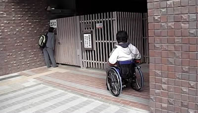 南東角段差10cm、学校に隣接する民家には歩道なし。白線のみ。
